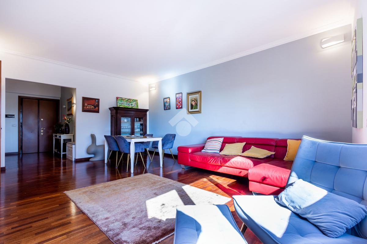 L'appartamento è composto da: ampio ingresso, salone con grandi finestre, cucina, due camere da letto, doppi servizi finestrati (di cui uno in camera) e ampio balcone abitabile.